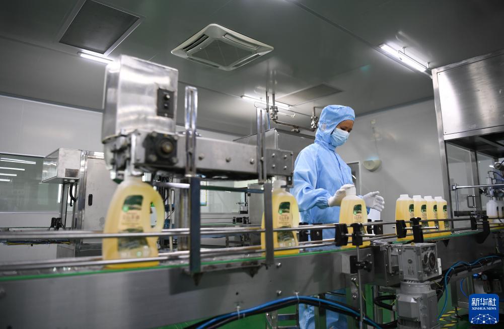 在位于乳源瑤族自治縣的廣東寶華農業科技股份有限公司車間內,工作人員在茶油灌裝生產線上(10月19日攝)。