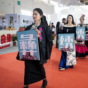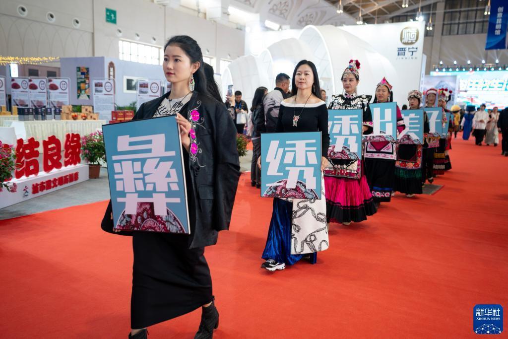 10月20日,參展工作人員在創意云南文化產業博覽會上展示彝繡服飾。