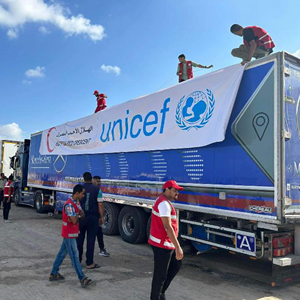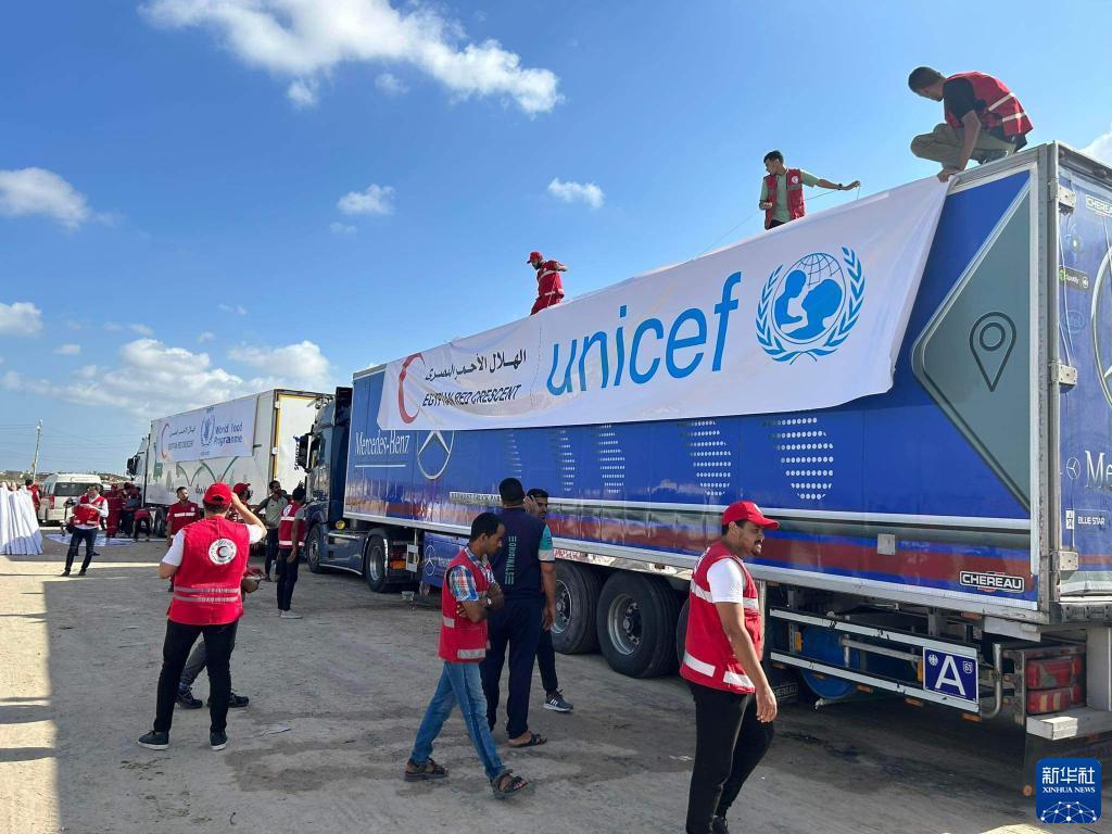 10月20日,在埃及東北部距離拉法口岸45公里的阿里什,埃及紅新月會的工作人員在準備運送援助物資的卡車。
