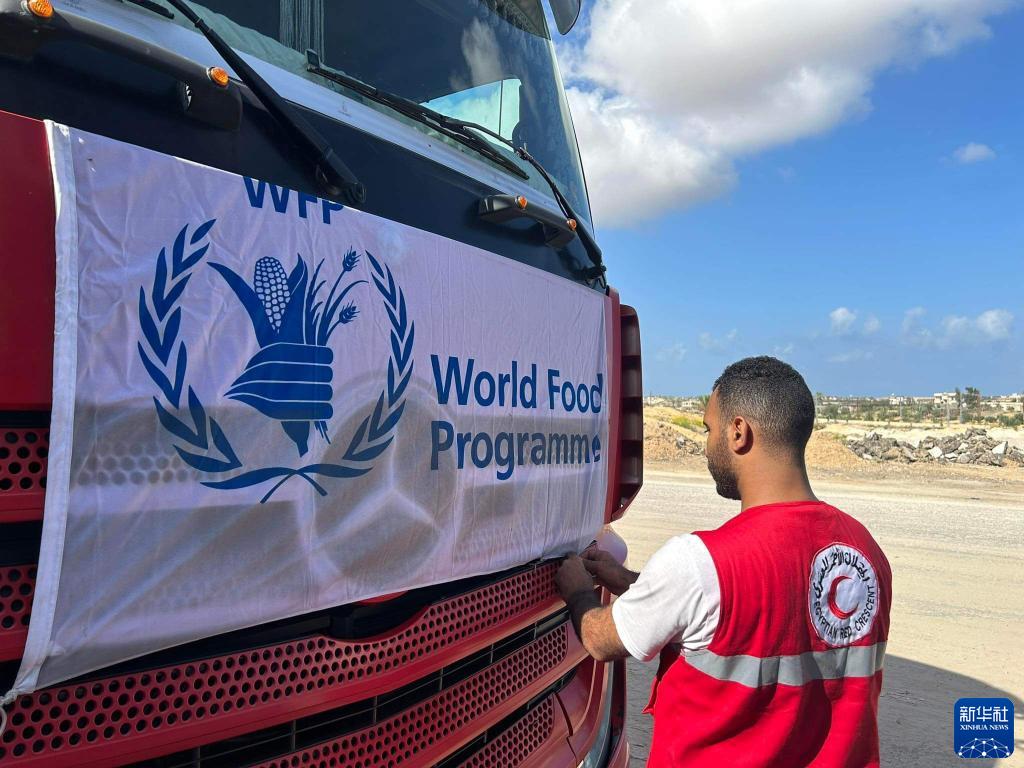 10月20日,在埃及東北部距離拉法口岸45公里的阿里什,埃及紅新月會的工作人員在準備運送援助物資的卡車。
