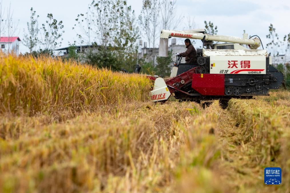 在湖北省天門市石家河鎮唐店村,農民操作農機收割水稻(10月19日攝)。