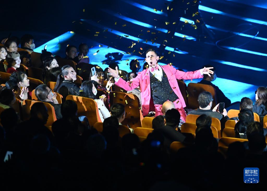 10月20日,演員在第十九屆中國吳橋國際雜技藝術節開幕式上與觀眾互動。