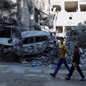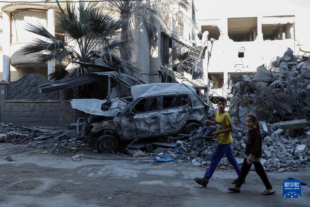 10月20日,在加沙地帶南部城市汗尤尼斯,兒童走過遭以色列襲擊損毀的建筑。