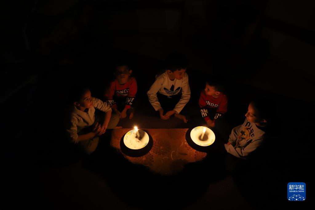 這是10月20日在加沙地帶南部城市汗尤尼斯拍攝的使用蠟燭照明的兒童。
