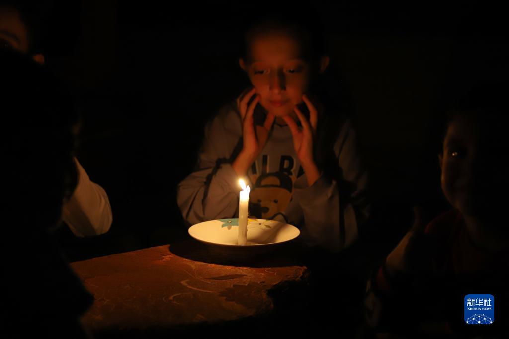 這是10月20日在加沙地帶南部城市汗尤尼斯拍攝的使用蠟燭照明的兒童。