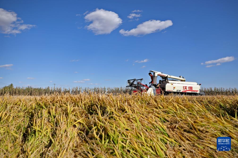 10月20日,農業機械在盤錦市遼河三角洲尤巧元家庭農場的稻田里收割水稻。