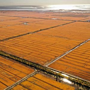 金秋時節,我國水稻主要產區之一——遼寧省盤錦市遼河三角洲水稻產區迎來集中收割季,一臺臺農機在田野上收割莊稼,空中俯瞰大片田地滿目金黃。