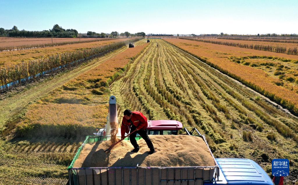 金秋時節,我國水稻主要產區之一——遼寧省盤錦市遼河三角洲水稻產區迎來集中收割季,一臺臺農機在田野上收割莊稼,空中俯瞰大片田地滿目金黃。