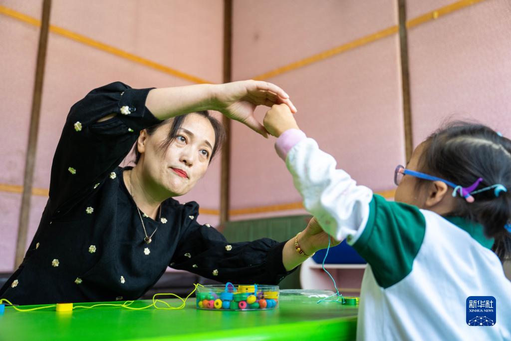 10月18日,常德市桃源特殊教育學校校長彭敏在單訓室給學生做康復訓練。