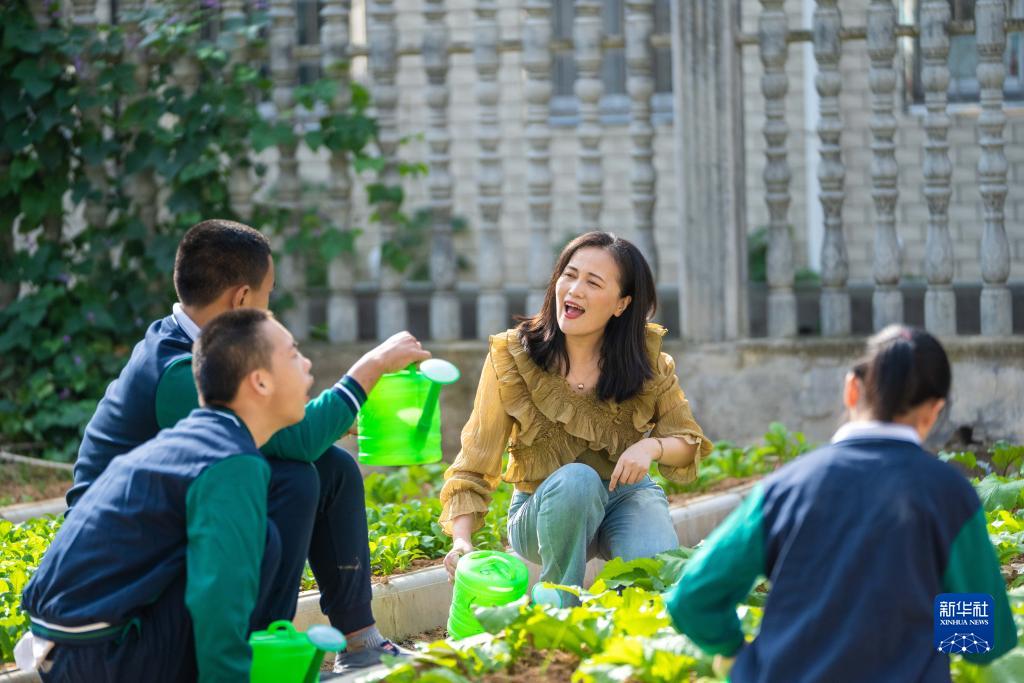 10月19日,常德市桃源特殊教育學校校長彭敏(右二)和學生參與勞動實踐活動。