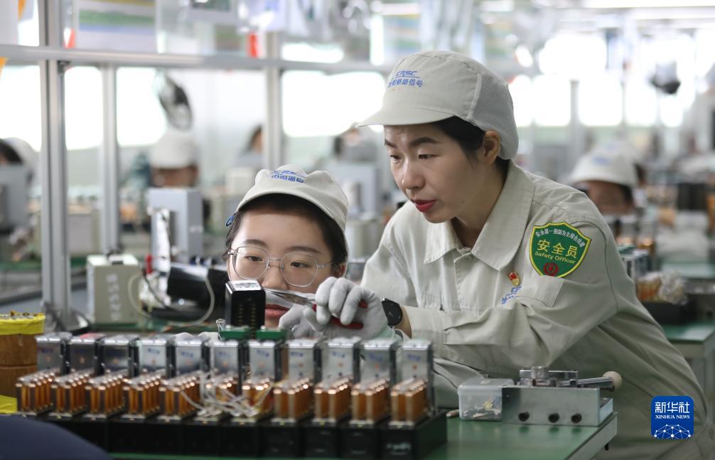 柯曉賓(右)在沈陽鐵路信號有限責任公司電器車間指導班組成員生產繼電器(10月17日攝)。