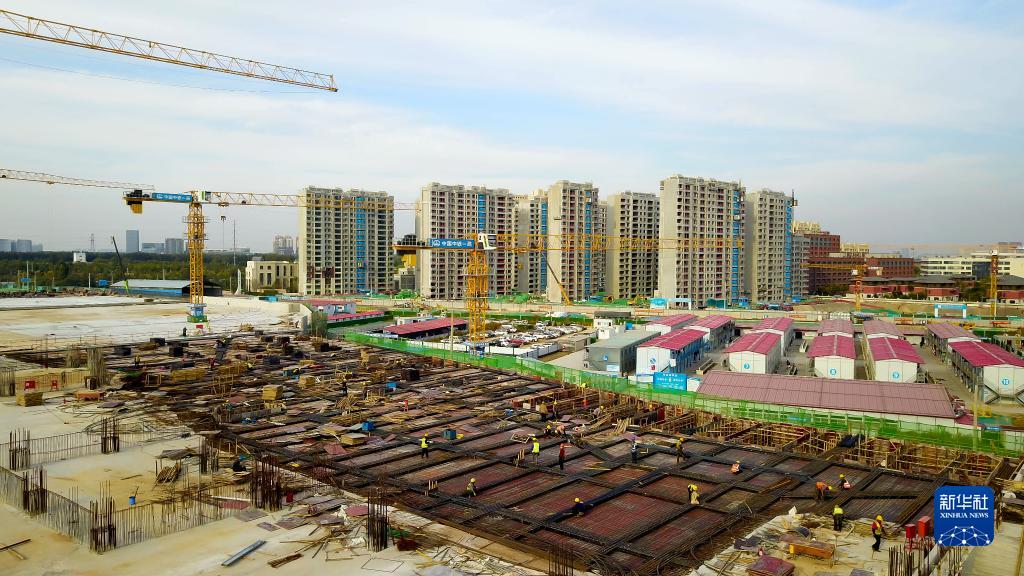 10月21日,在濟南地鐵6號線位里莊車輛段,中鐵一局的工作人員在進行主體蓋板施工(無人機照片)。