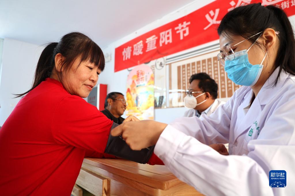 10月21日,在山東省濱州市一處養老服務中心,志愿者為老人測量血壓。