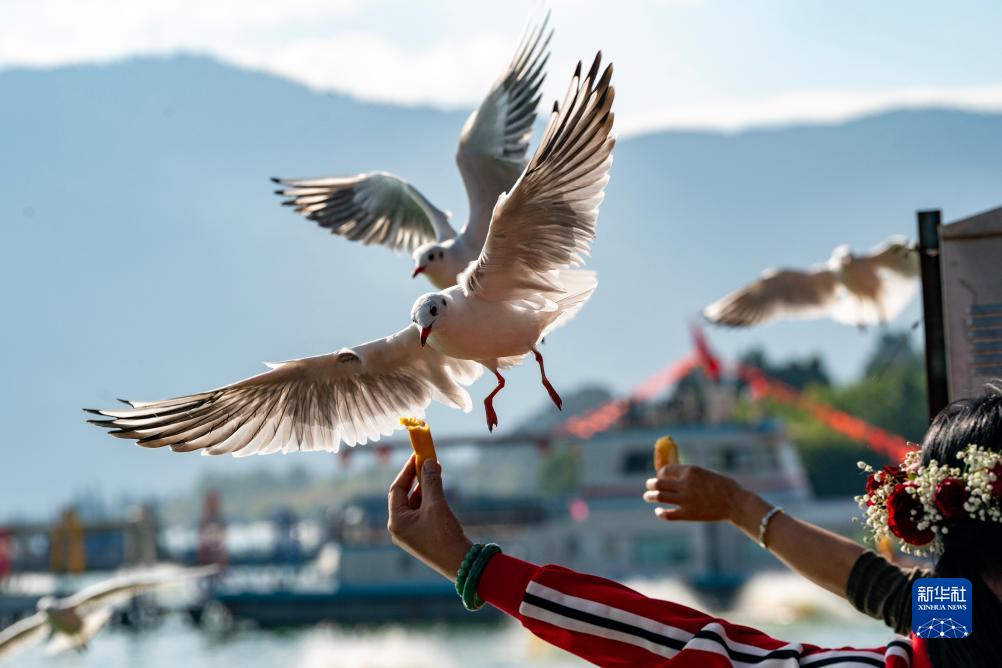 10月16日,游客在昆明市滇池邊喂紅嘴鷗。