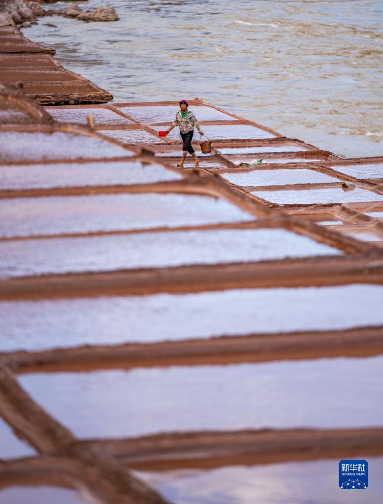 西藏昌都市芒康縣納西民族鄉一名村民在鹽田里勞作(10月20日攝)。
