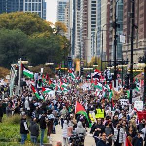 當天,芝加哥民眾走上街頭參加游行活動,表達對巴勒斯坦人民的支持,抗議以色列對加沙地帶的封鎖。