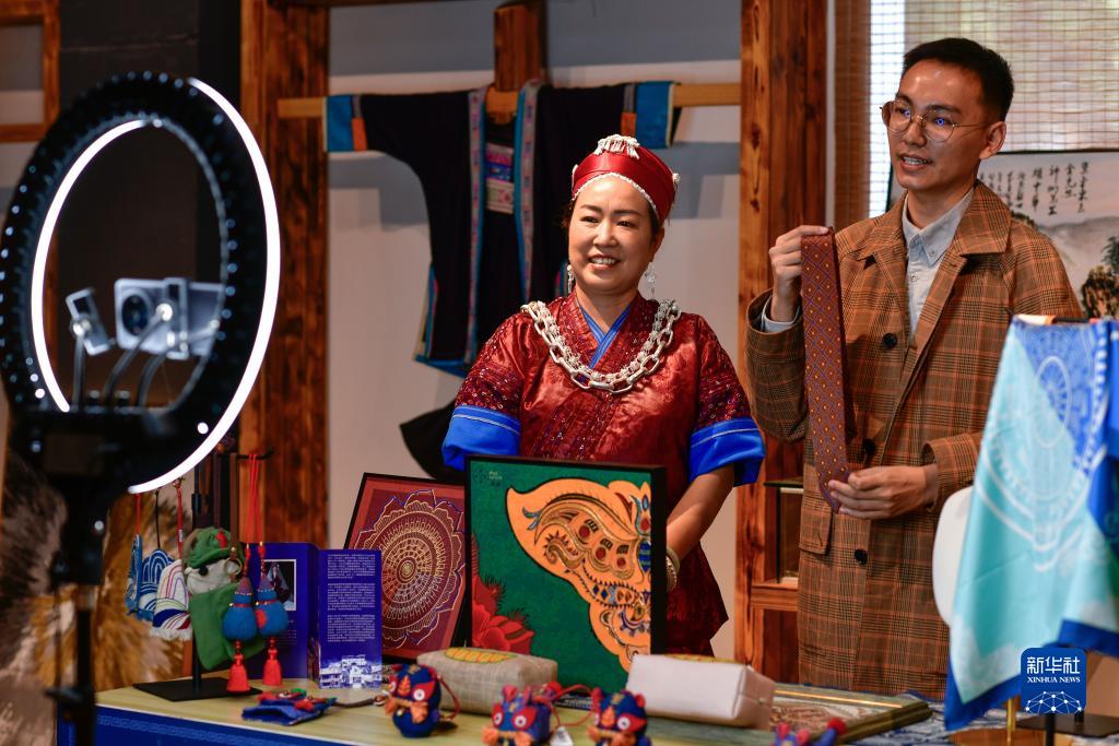 龍祿穎與兒子在公司的鄉村振興直播間推介苗繡文創產品(10月18日攝)。