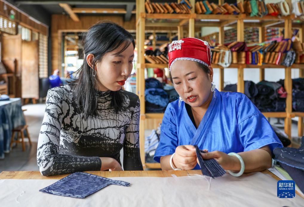 在舞水云臺旅游商品開發有限公司設計室,龍祿穎(右)與留美歸國設計師王雨楠研發新苗繡產品(2022年6月28日攝) 。