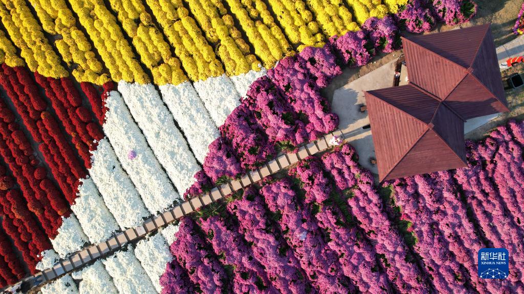 這是10月21日在江蘇射陽縣洋馬鎮拍攝的第二十八屆洋馬菊花節現場(無人機照片)。