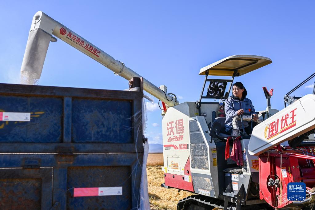 10月20日,劉春艷在琿春市三家子滿族鄉東崗子村的水稻田里駕駛收割機收割水稻。