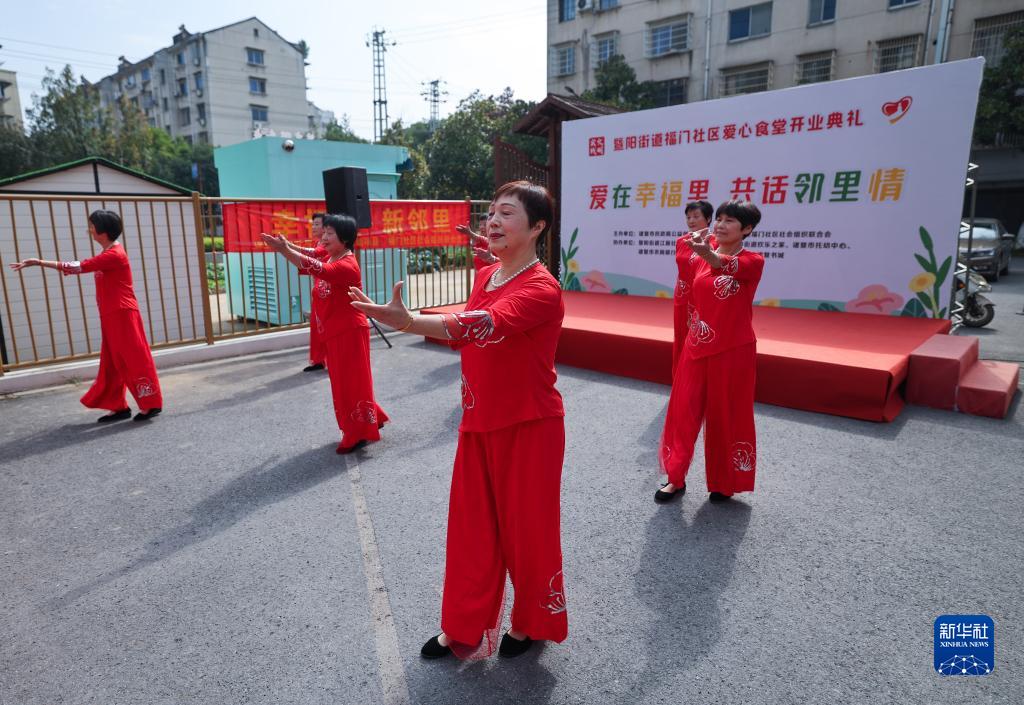 10月22日,在諸暨市暨陽街道福門社區愛心食堂前,老人參加重陽節文藝表演。
