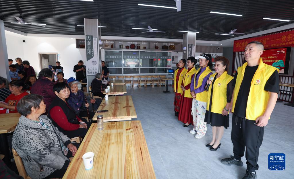 10月22日,在諸暨市楓橋鎮永安社區愛心食堂,志愿者在給老人們表演節目。