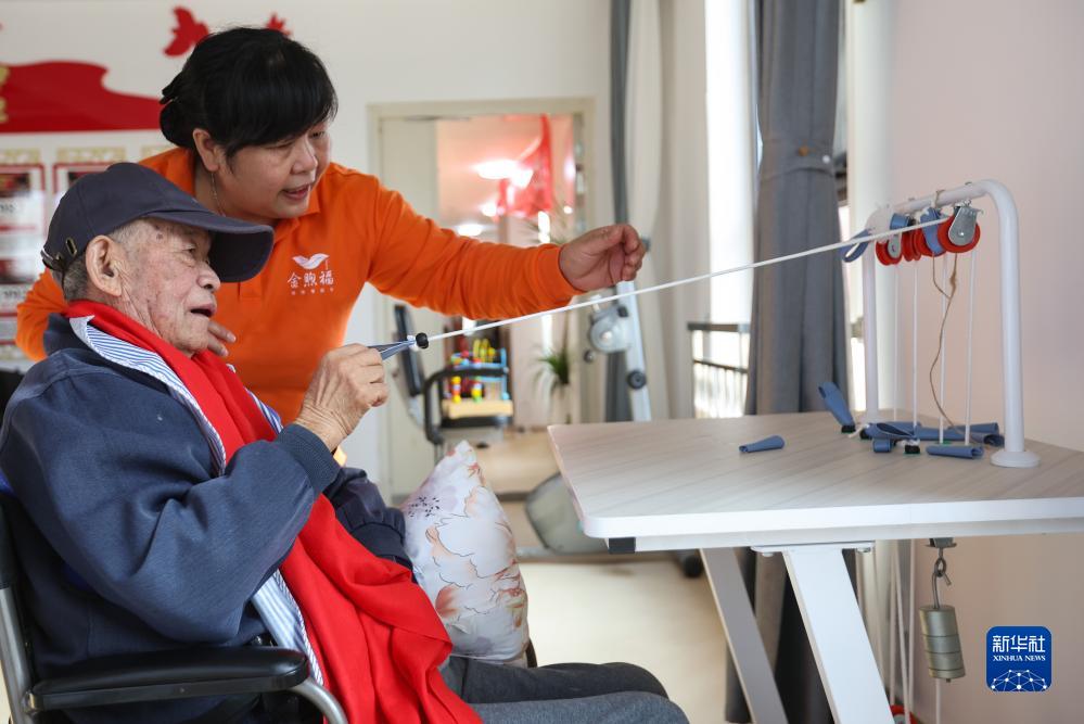 10月22日,在金煦福武侯萬壽頤養中心,護理人員引導老人進行康復治療。