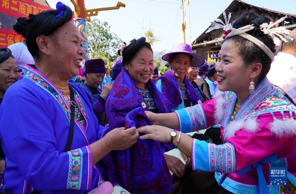 10月21日,在廣西融水苗族自治縣白云鄉龍岑苗寨,外嫁女給老人贈送過節物品。