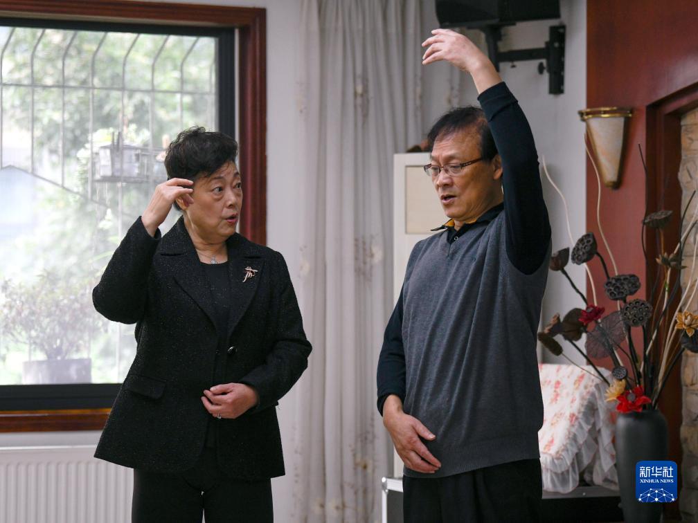 10月21日,鄭義華(左)和丈夫李永東在家練習聲樂發聲。
