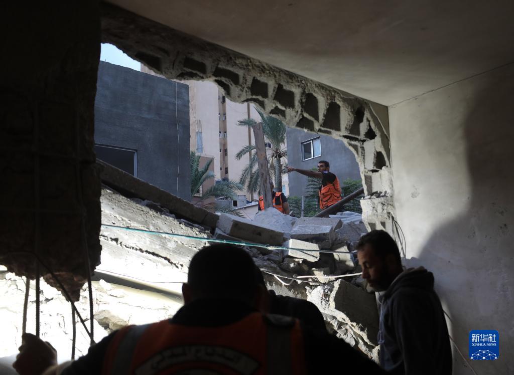10月22日,在加沙城,人們在遭以色列襲擊損毀的建筑中實施救援。