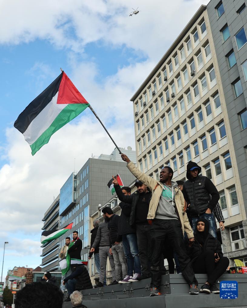 當日,眾多巴勒斯坦支持者在位于比利時布魯塞爾的歐盟總部附近舉行集會,聲援巴勒斯坦。