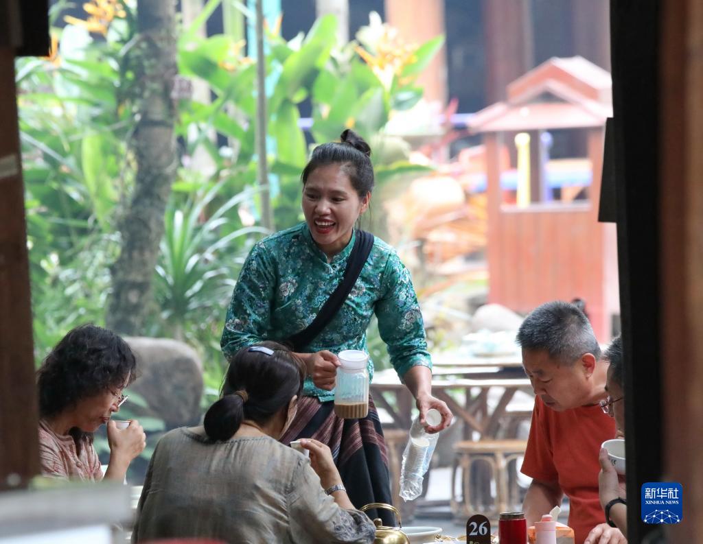 10月22日,在云南省景洪市曼聽村村民經營的一處“傣家樂”,村民為就餐的游客服務。
