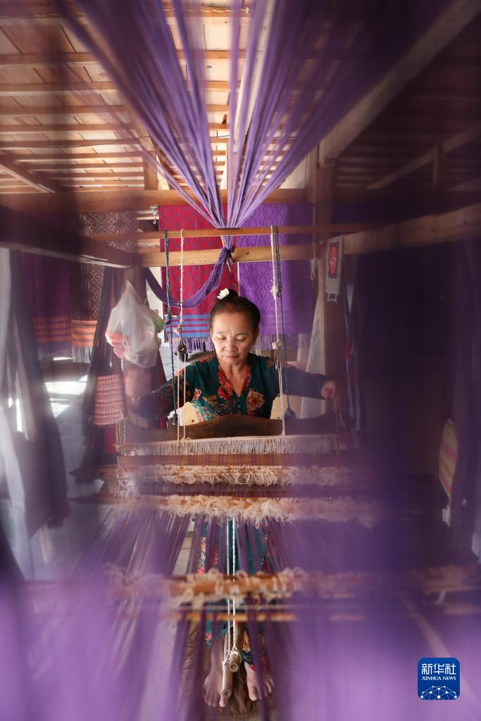 10月18日,云南省景洪市勐罕鎮曼聽村傣族婦女在非遺展示區制作傣錦。