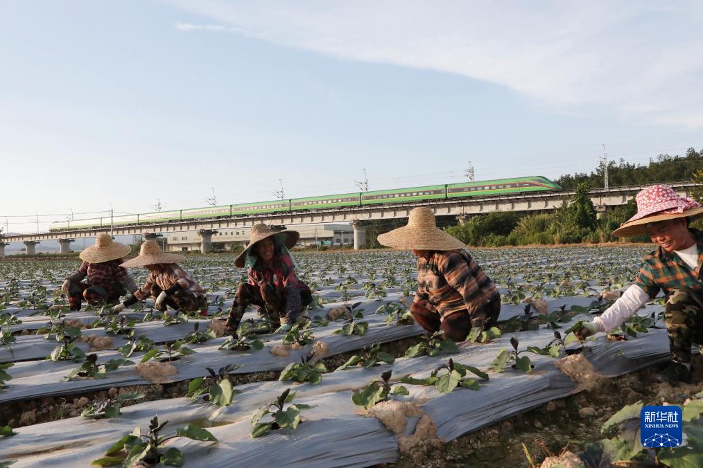 10月20日,云南省景洪市勐罕鎮村民在一處種植基地務工,身后的中老鐵路上動車飛馳。