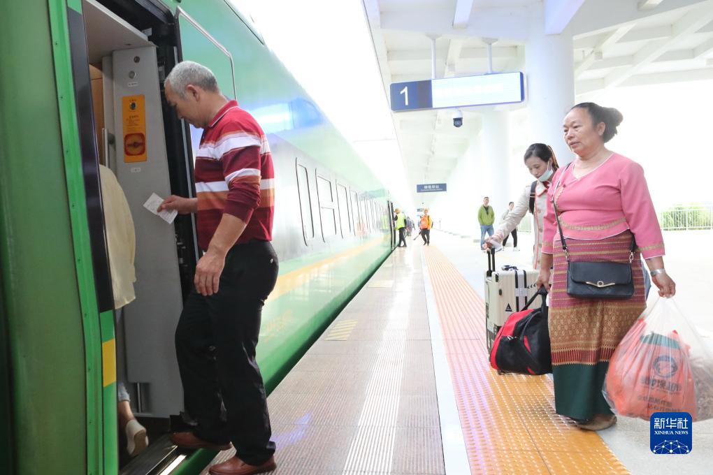 10月19日,云南省景洪市勐罕鎮曼聽村村民咪么拉(右一)在中老鐵路橄欖壩站乘坐動車出行。