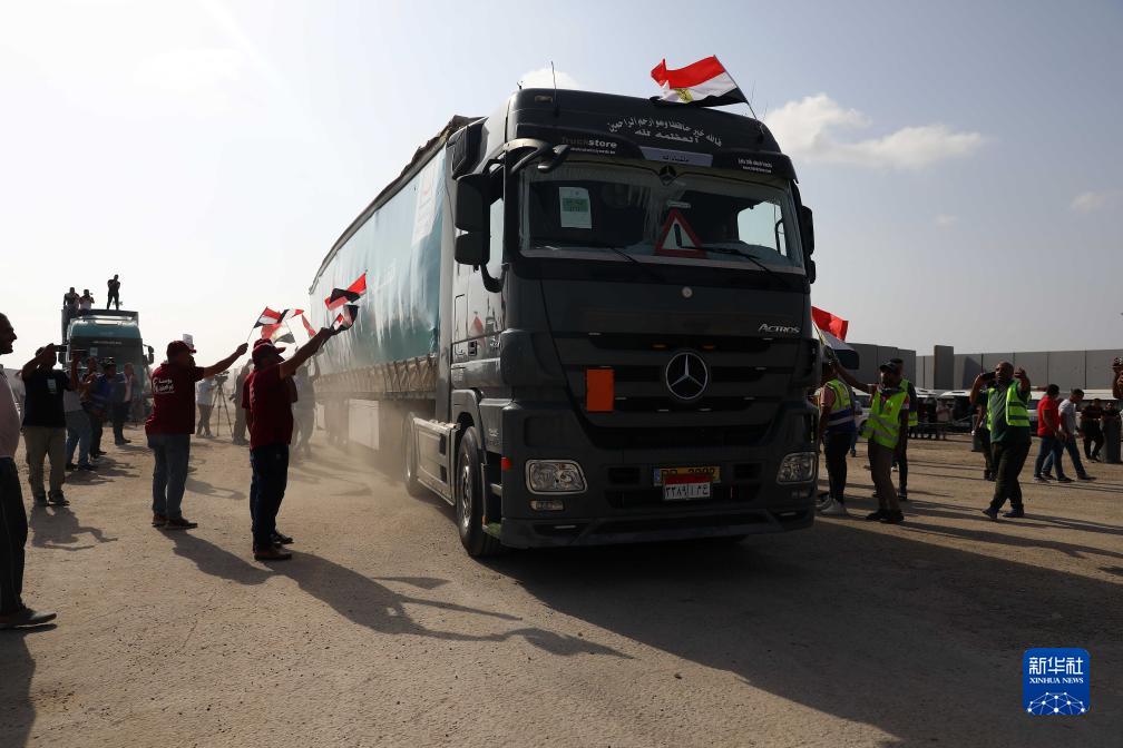 10月22日,在拉法口岸埃及一側,載有人道救援物資的貨車準備通過拉法口岸前往加沙地帶。