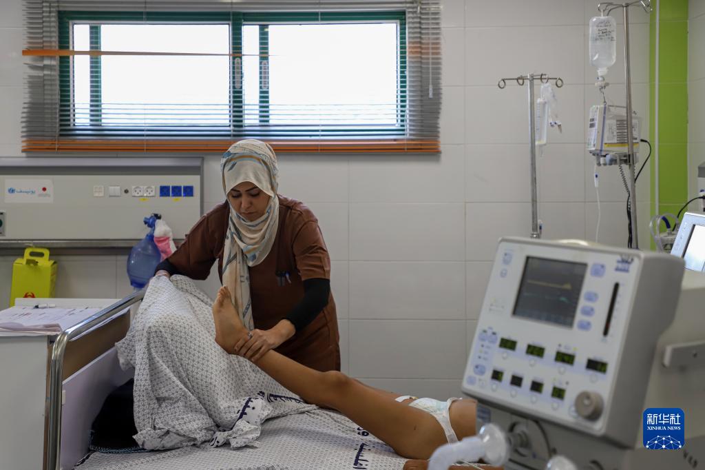 10月22日,在加沙地帶南部城市汗尤尼斯的納賽爾醫院,醫務人員救治在以色列空襲中受傷的兒童。