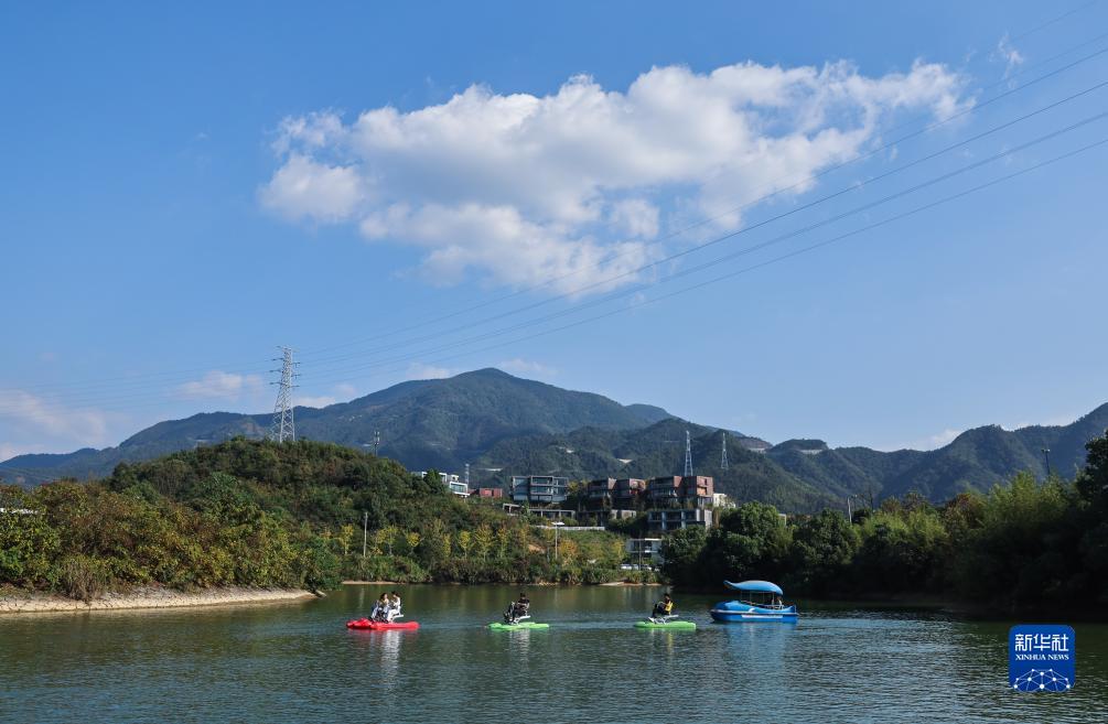 10月23日,游客在建德市楊村橋鎮嶺源樂活島休閑基地體驗水上運動項目。