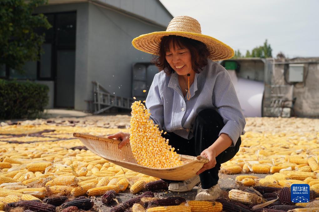 在北京市平谷區北臺頭村村委會,王翠云篩選玉米粒(10月4日攝)。