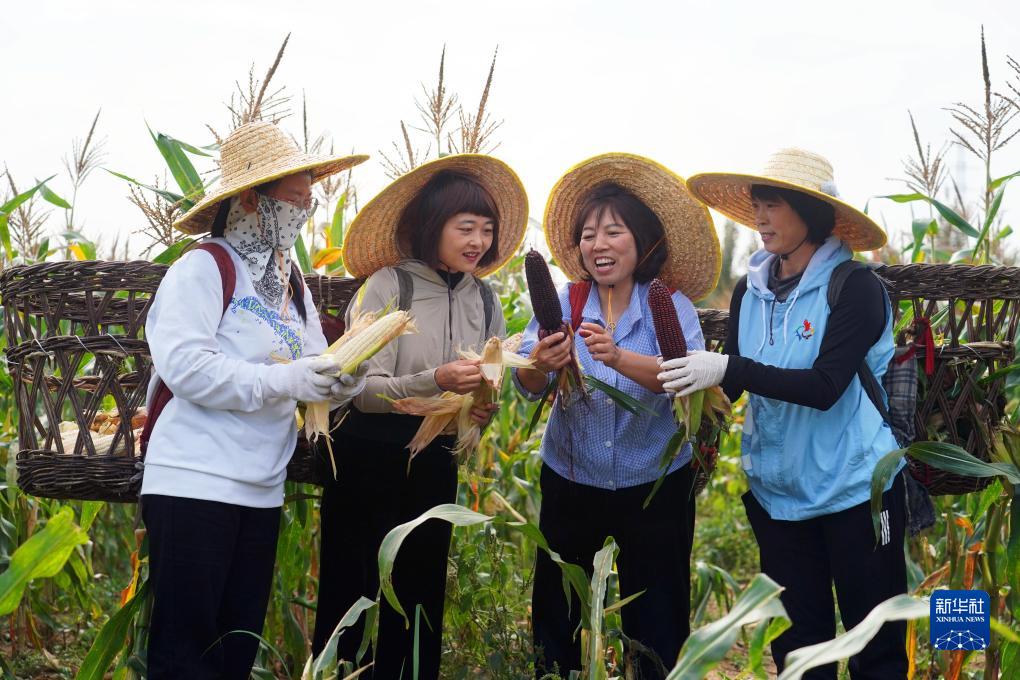 在北京市平谷區北臺頭村“博士農場”,王翠云(右二)采摘完玉米后與村民交流(10月4日攝)。