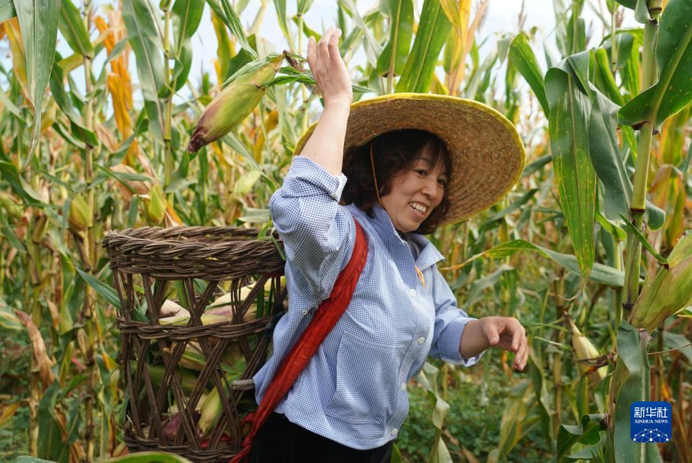 在北京市平谷區北臺頭村“博士農場”,王翠云采摘玉米(10月4日攝)。