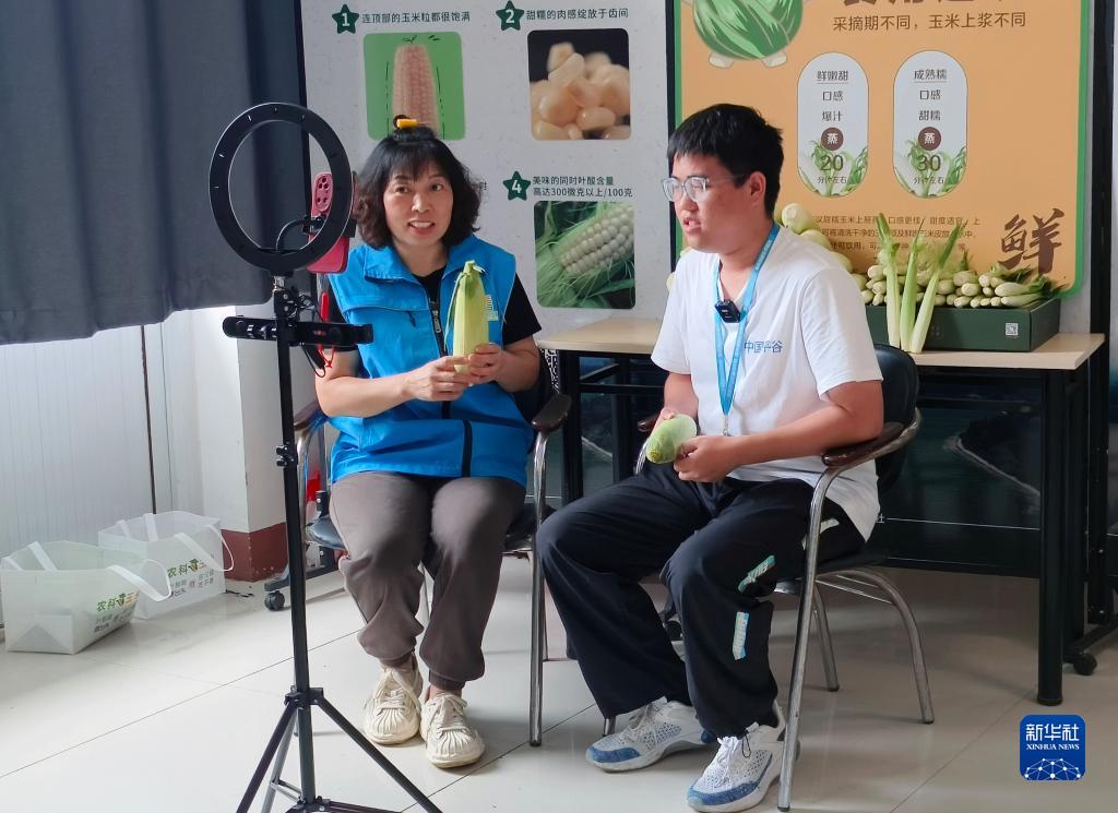 王翠云(左)與暑期社會實踐大學生一起在北臺頭村村委會通過視頻直播銷售玉米(8月3日攝,手機照片)。