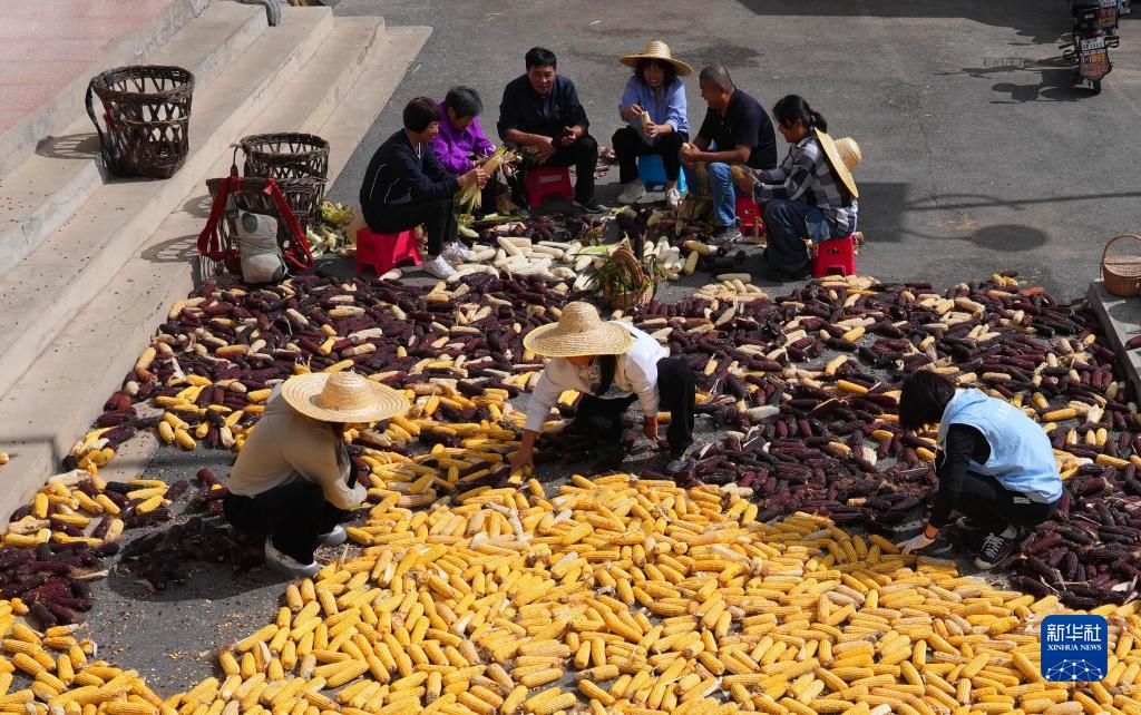 在北京市平谷區北臺頭村村委會,王翠云(后右三)與村民一起剝玉米(10月4日攝)。