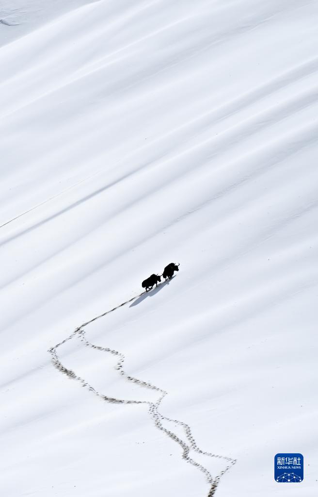 10月16日,在阿爾金山國家級自然保護區,野牦牛攀爬雪后的庫木庫里沙漠。