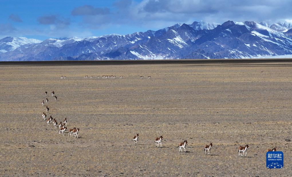 10月17日,在阿爾金山國家級自然保護區,藏野驢在草原上奔跑(無人機照片)。