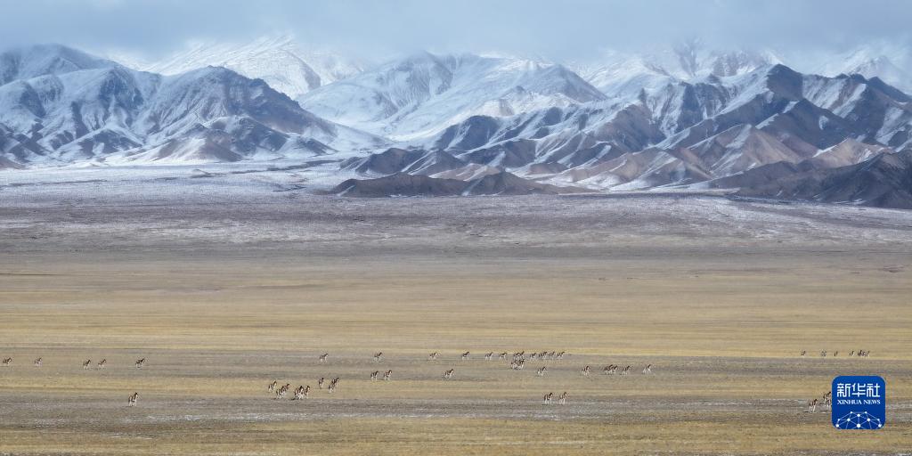 10月16日,在阿爾金山國家級自然保護區,藏野驢在草原上覓食(無人機照片)。