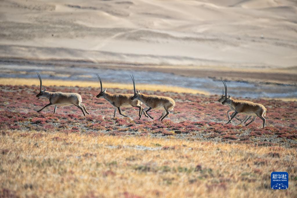 10月13日在阿爾金山國家級自然保護區拍攝的一群奔跑的藏羚。