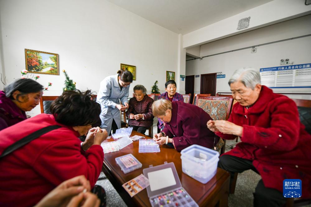 10月20日,在四川省眉山市彭山區社會福利院,趙鳳章老奶奶(右四)和福利院其他老人一起學做手工。