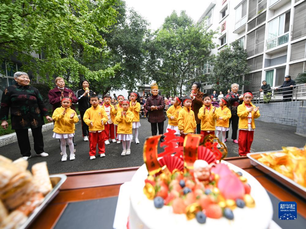 10月20日,在四川省眉山市彭山區社會福利院,彭山區幼兒園的小朋友一起為趙鳳章老奶奶(中)祝壽。