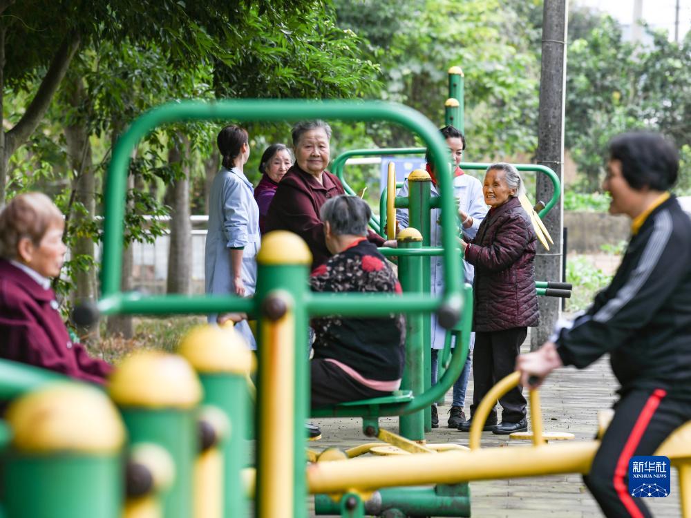 10月20日,在四川省眉山市彭山區社會福利院,趙鳳章老奶奶(右二)在福利院工作人員陪同下鍛煉身體。
